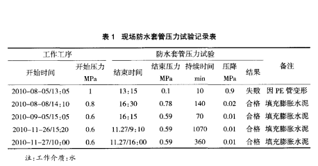 經(jīng)過(guò)一個(gè)月的反復(fù)試壓試驗(yàn),套管沒(méi)有再發(fā)現(xiàn)滲漏現(xiàn)象,試壓成功?,F(xiàn)場(chǎng)防水套管壓力試驗(yàn)記錄數(shù)據(jù)詳見(jiàn)表1。
