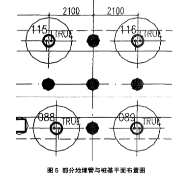 供、回水分別集中到單獨(dú)的分、集水器上。水平聯(lián)絡(luò)管采用De63、De75PE管,整個(gè)土壤換熱器系統(tǒng)按同程方式連接,確保各換熱孔內(nèi)循環(huán)液的流量、流速一致,為系統(tǒng)的安全運(yùn)行提供可靠的保障。部分地埋管與樁基平面布置如圖5所示。