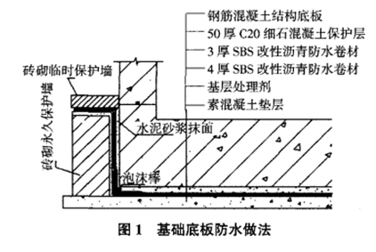 本項(xiàng)目地下防水設(shè)防等級(jí)為I級(jí),采用鋼筋混凝土結(jié)構(gòu)自防水和柔性防水卷材相結(jié)合的防水設(shè)計(jì)[1】。地下基礎(chǔ)底板柔性防水層采用“3 mm+4 mm”雙層SBS改性瀝青防水卷材的防水設(shè)計(jì),見(jiàn)圖1。地下室立墻、車(chē)庫(kù)頂板柔性防水層采用3 mm厚SBS改性瀝青防水卷材和4 mm厚復(fù)合銅胎基耐根穿刺防水卷材的防水設(shè)計(jì)。