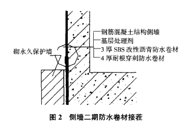 底板部位的卷材與永久性保護(hù)墻的接觸部位應(yīng)空鋪或適當(dāng)點(diǎn)粘(以適應(yīng)結(jié)構(gòu)的不均勻沉降),永久性保護(hù)墻頂面預(yù)留甩茬的卷材上面蓋兩皮磚進(jìn)行臨時(shí)保護(hù),待二期接茬時(shí)拆掉臨時(shí)保護(hù)墻,與外墻卷材進(jìn)行搭接。側(cè)墻二期防水卷材接茬示意見(jiàn)圖2。