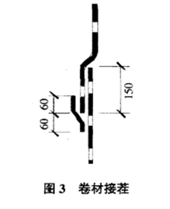 根據(jù)國(guó)家規(guī)范GB 50208-2002《地下防水工程質(zhì)量驗(yàn)收規(guī)范》,底板預(yù)留的甩茬卷材與外墻的卷材搭接接茬寬度不小于150mm,為了在接茬部位將安全保險(xiǎn)系數(shù)提到最大,在最外層卷材接茬部位再增加一蓋口條,蓋口條卷材與大面卷材同材質(zhì),同規(guī)格,寬120 mm,見(jiàn)圖3。