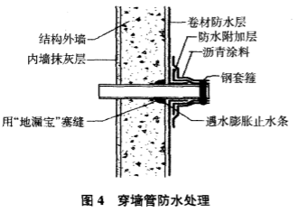 本身未做超前止水處理,所以該類(lèi)穿墻管道很容易滲漏,本工程防水處理見(jiàn)圖4。